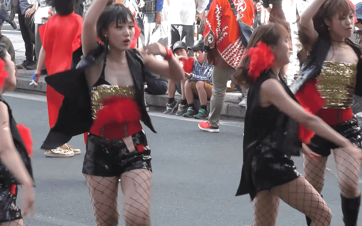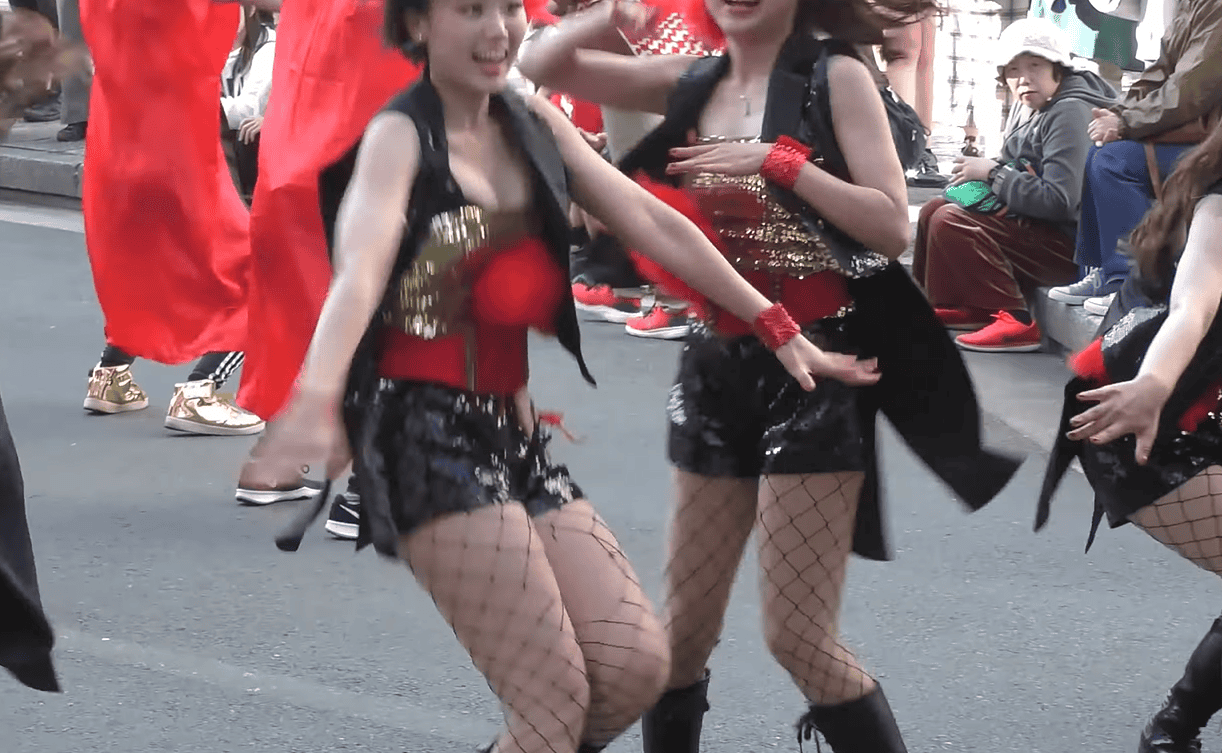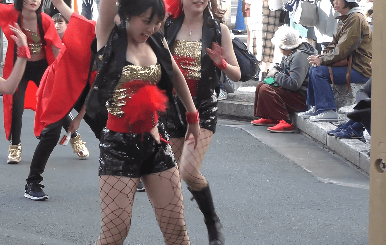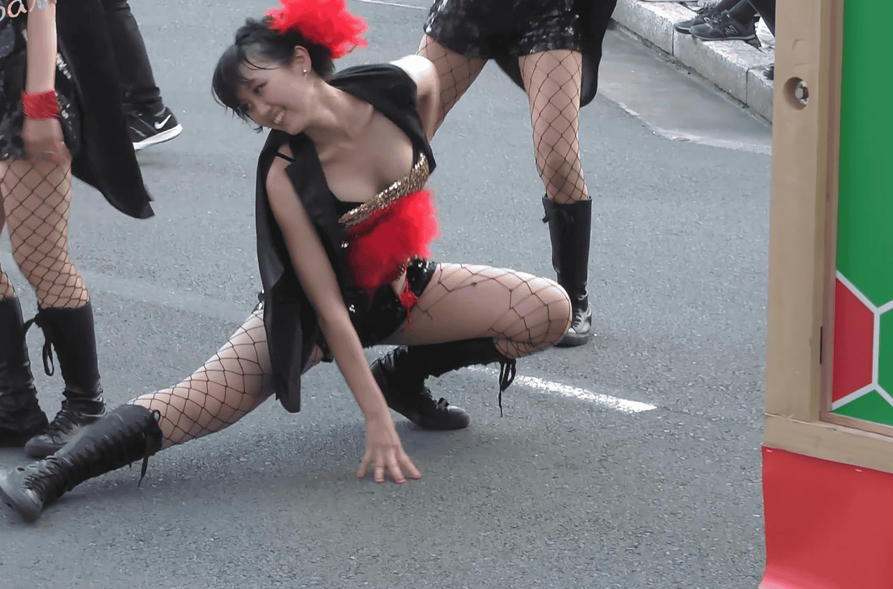写真に写っているお姉さん、いかがでしょうか。元気そうなスレンダーちゃんですが、ダンス初盤からもう衣装がずり落ちています。そして黒いブラジャーがはみ出しちゃっています!当の本人は気にも留めていない様子で、遠慮なくジャンプしたり前かがみになったり、ちっとも焦っていなさそうです。