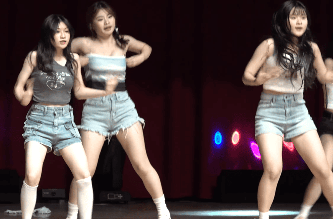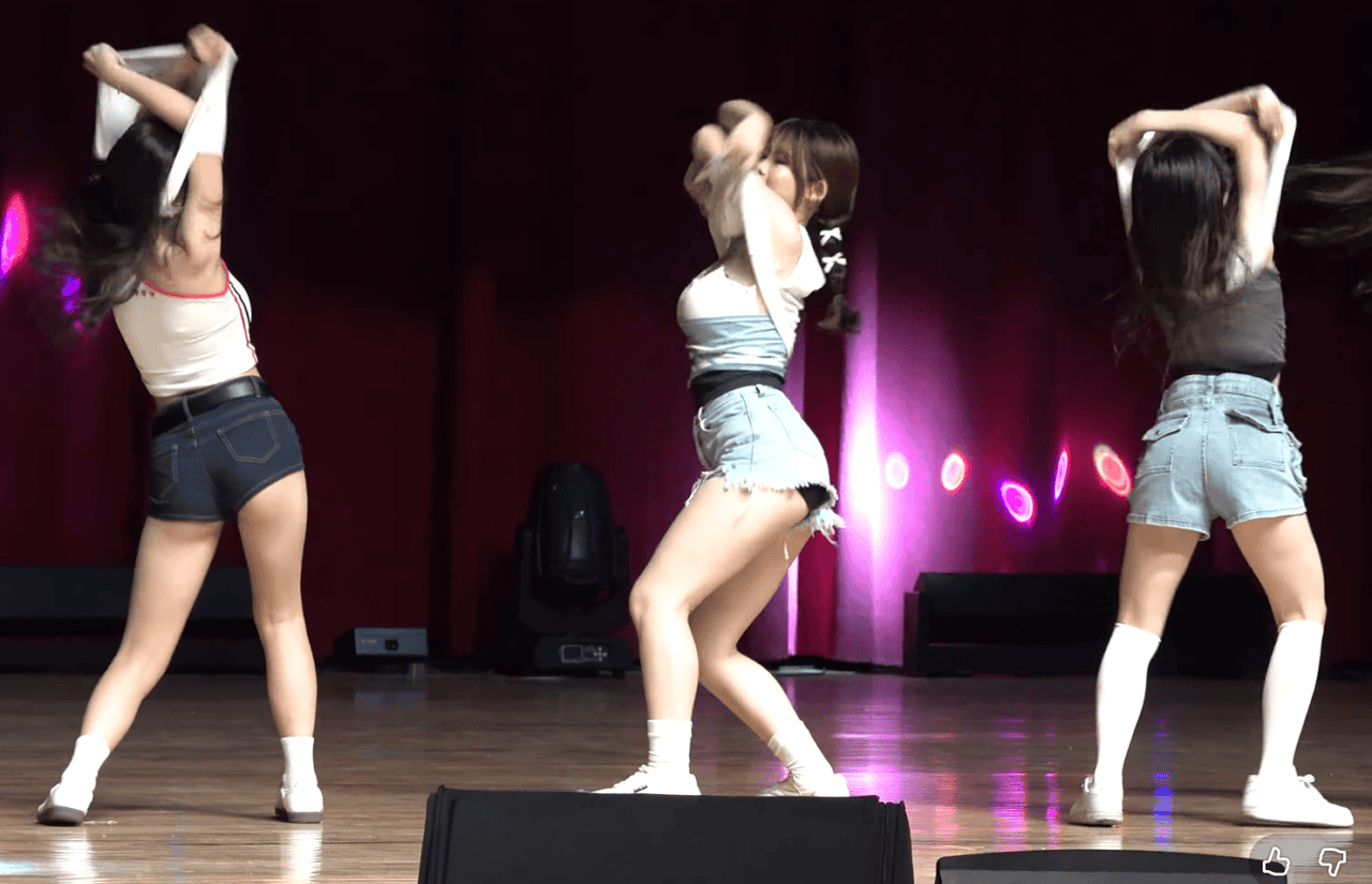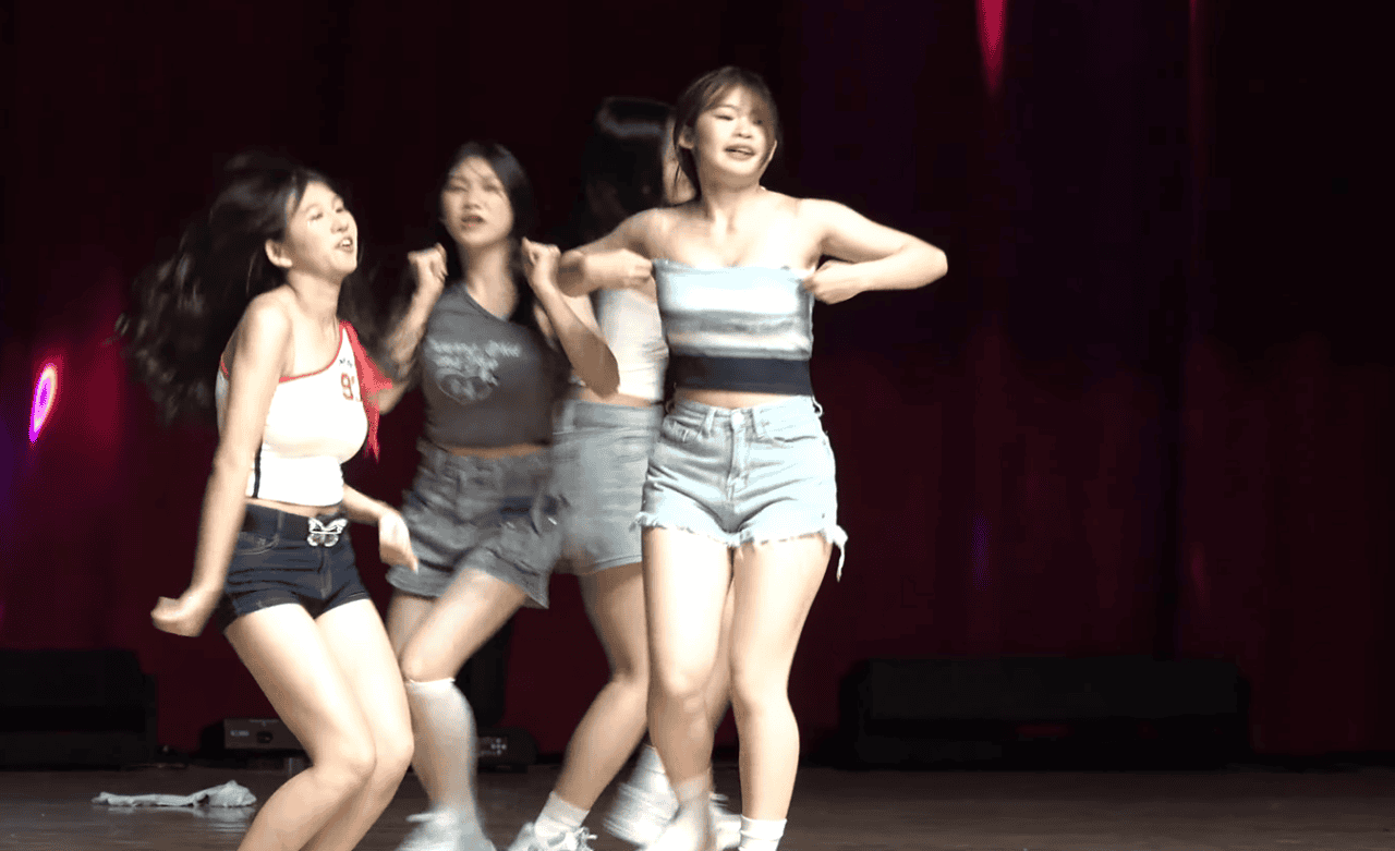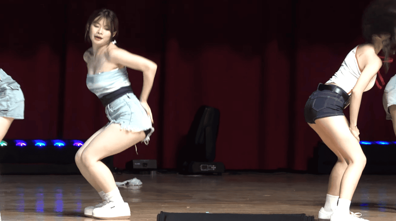 さて、彼女たち、前半はタンクトップを着用したまま踊っているのですが、1:02に差し掛かったところ(写真2枚目)です。予想通り、タンクトップを脱ぎ捨てました!これぞ台湾女子ダンスの醍醐味ですね。そしてやはりというか巨乳ちゃん、というよりもはや爆乳!でっかくて柔らかそうなおっぱいが現れました!そんな爆乳を揺らし踊るのですが、どうやらチューブトップがずり落ちてしまうようで、何度も衣装を直す様子が伺えます。これには面喰らいました、辛抱たまらんですな、、、