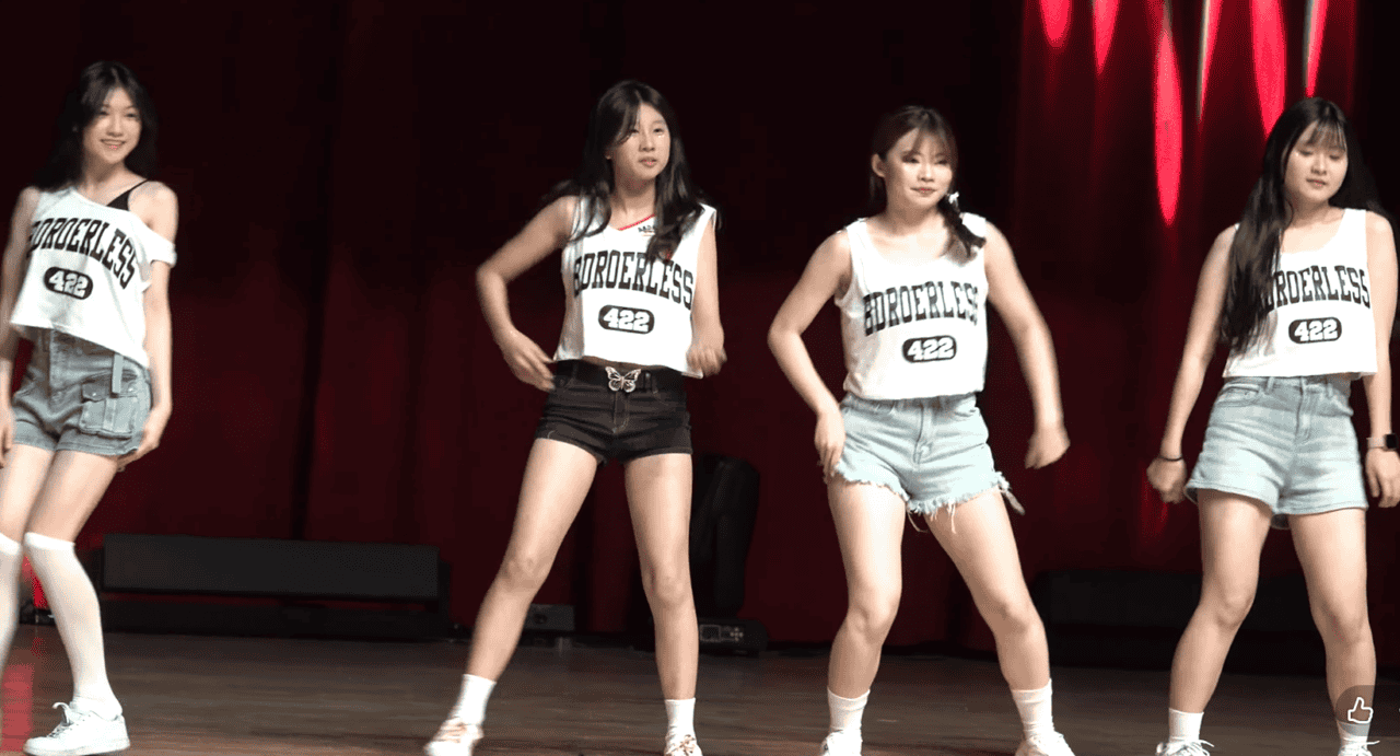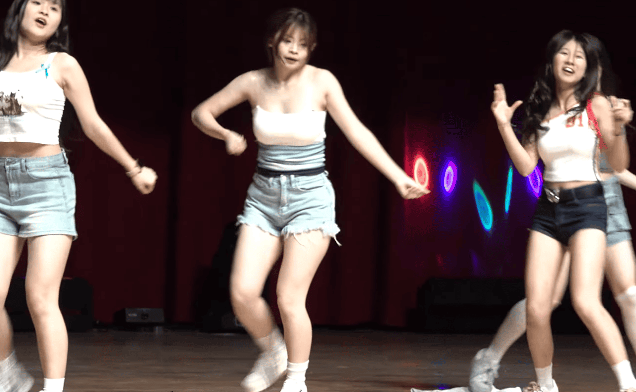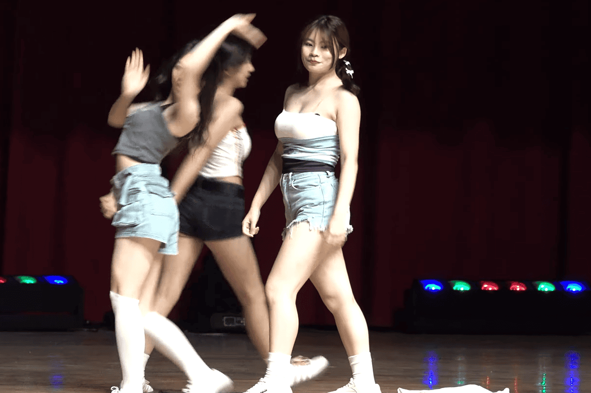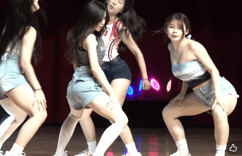 さて、彼女たち、前半はタンクトップを着用したまま踊っているのですが、1:02に差し掛かったところ(写真2枚目)です。予想通り、タンクトップを脱ぎ捨てました!これぞ台湾女子ダンスの醍醐味ですね。そしてやはりというか巨乳ちゃん、というよりもはや爆乳!でっかくて柔らかそうなおっぱいが現れました!そんな爆乳を揺らし踊るのですが、どうやらチューブトップがずり落ちてしまうようで、何度も衣装を直す様子が伺えます。これには面喰らいました、辛抱たまらんですな、、、